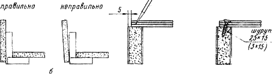 В местах установки шурупов сделайте накол шилом (рис. 31. г), причем накол должен быть как можно более глубоким, чтобы шуруп легче ввертывался, и с небольшим наклоном, чтобы он не вышел внутрь шкафа. (В полке и надъящичной рамке наколы делают без наклона.) Шурупы завертывайте отверткой. Ни в коем случае не забивайте шурупы молотком. Можете расколоть плиту. К тому же забитые шурупы не обеспечивают надежного крепления и по могут вывертываться и ввертываться в свое гнездо при последующих разборке и сборке.