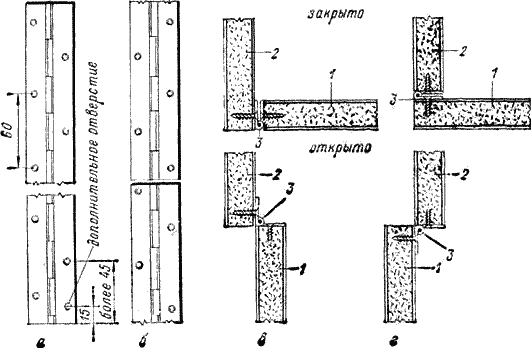 Рис. 33. Навешивание дверок с помощью рояльных петель: а – цельная рояльная петля; б – составная рояльная петля (из обрезков); в – навешивание вставной дверки; г – навешивание накладной дверки; 1 – дверка; 2 – боковая стенка; 3 – петля