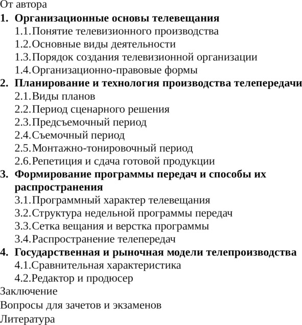 К рассмотрению этих и ряда других непременных факторов телепроцесса мы и обратимся в предлагаемом учебном пособии. Оно поможет будущим профессионалам ТВ лучше уяснить специфику отрасли, представить свои конкретные функции (режиссера, оператора, продюсера) на общем фоне большой коллективной работы.