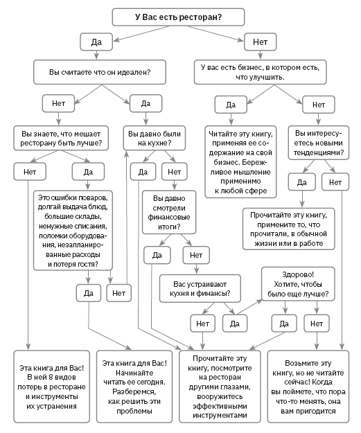 Если резюмировать, то в философии «Тойота» все строится вокруг потребности потребителя и на идее непрерывного улучшения за счет постоянного поиска и устранения потерь. Ресторан – это тоже производство, и в нем множество потерь, которые каждый день влияют на удовлетворенность гостя. В следующих главах книги мы детально рассмотрим все, что касается повышения эффективности работы ресторана.