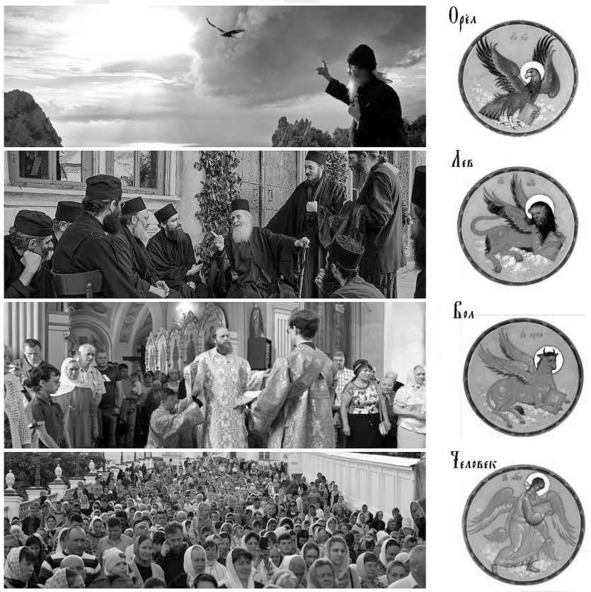 Говоря языком символов «тетраморфа» Четвероевангелия, идея согласного учения отцов залегает на уровне «Орла» (Бога Отца), как высшей 4-й ступени достижения духовного совершенства, которая символизирует раскрытие полноты духовного сознания, тогда как большинство верующих и священства находится на уровне «Человека» (Неофита), как 1-й ступени, которая символизирует исполнение заповедей и первичный переход от рационального состояния к нравственному и душевному.