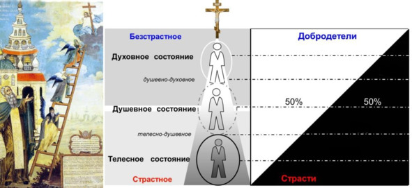 Так в «телесном» состоянии человека, как эгоцентричном, всецело доминируют качества и энергии эгоизма, именуемые у отцов «страстями». В отличие от него, в «душевном» состоянии человека, как нравственно-ориентированном, доминантными являются уже противоположные «страстям» качества (энергии) «добродетели» пока ещё только добродетели человеческой. А в «духовном» состоянии, как высшем, совершенном и благодатном, в душе доминируют уже высшие «Божественные добродетели».