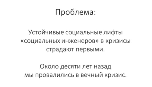 Особая проблема, которую важно не упустить из фокуса внимания, заключается в том, что в общественном развитии есть такая функция/страта/социальная группа – социальный инженер – те, кто преобразуют общественные состояния: устраивают новые формы взаимодействия, создают общественные институты и прочее. В кризисы появляется множество таких форм, а вот устойчивые социальные лифты для этих позиций разрушаются.
