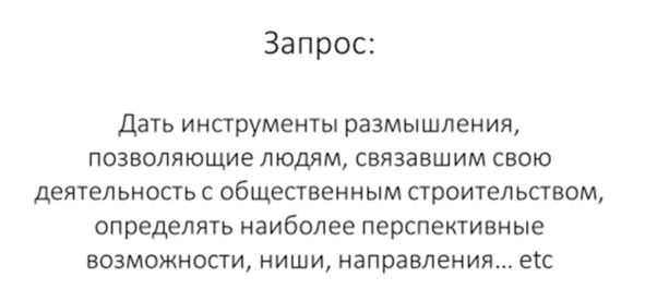 Мысль: дать попробовать инструменты размышления людям, которые связали свою деятельность с общественным строительством: как определять наиболее перспективные возможности, ниши, направления.