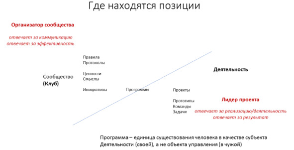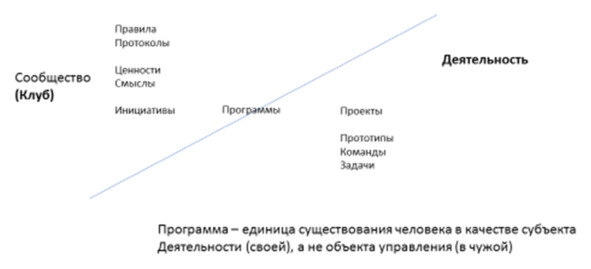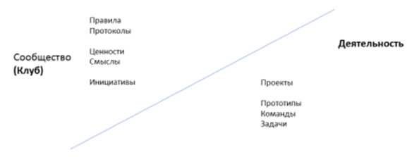И только в клубах (или сообществах) можно обсуждать то, что называется ценности и смыслы. Потому что в деятельности обсуждать ценности и смыслы некогда. Работать надо. А в сообществе это можно обсудить. (Рисунок 19)