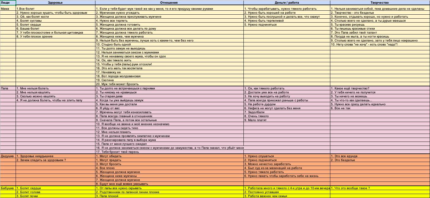 Запишите всё: негативное и позитивное, не упускайте ничего. Чем подробнее, тем лучше. Верхний пример упрощен, как минимум, десятикратно, просто чтобы поместиться на странице. На самом деле, для каждого человека и по каждой теме хорошо бы набрать высказываний по 10. Ниже вы видите часть большой и хорошо заполненной таблицы – прочитать сложно, но понятно количество убеждений: