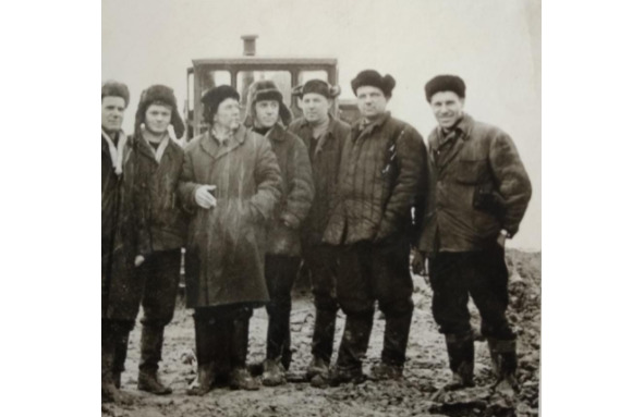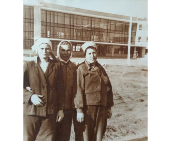 Лидия Яковенко (в центре) на фоне строящегося ДК Химиков