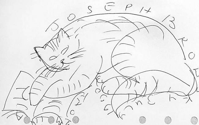 Магический кот Иосифа Бродского читает книгу. Подпись на рисунке: JOSEPH BRODSKY, July 1990, TAORMINA (рисунок из архива Эвелины Шац, публикуется с разрешения Фонда И. Бродского).
