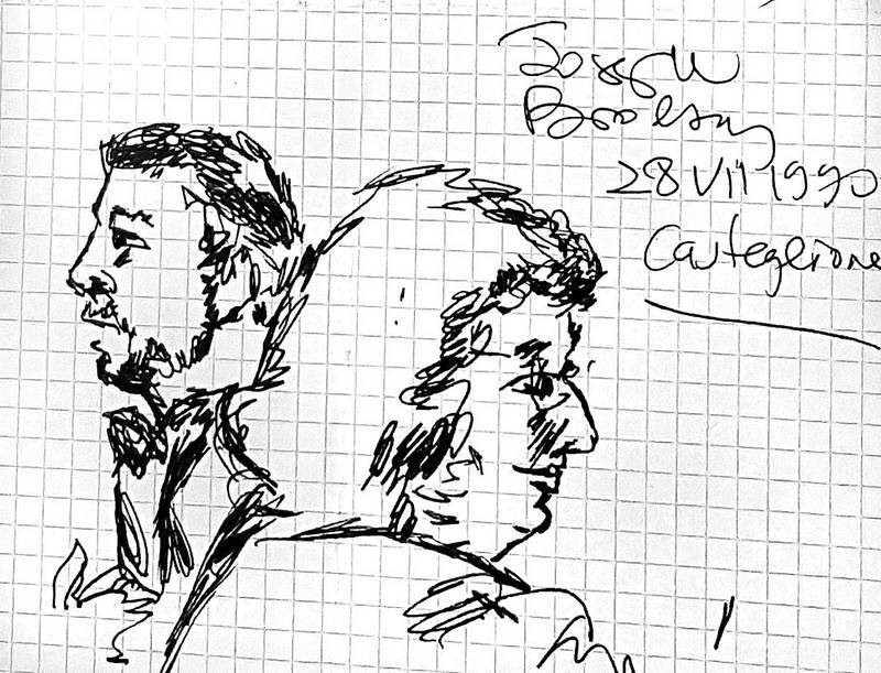 Рисунок Иосифа Бродского двух зрителей из публики на церемонии вручения премии в Кастильоне-ди-Сичилиа 28 июля 1990 года (рис. из архива Эвелины Шац, публикуется с разрешения Фонда И. Бродского).
