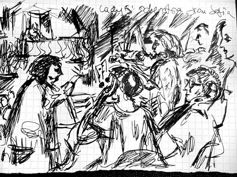 На следующий день, 28 июля 1990 года, перед церемонией награждения премией поэт попросил у Эвелины блокнотик в клеточку и нарисовал в нем еще два рисунка: «Профили двух зрителей» и «Женский оркестр», а также набросал «итальянскую речь».