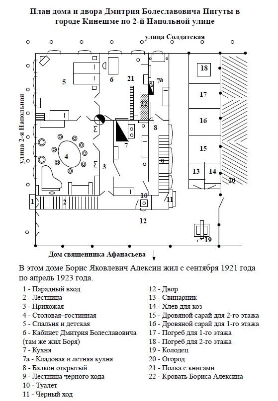 2-ая Напольная улица находилась на самой окраине города, после дома Афанасьевых стояло ещё три, а затем начиналась дорога, ведущая в темневший большой лес. От дома, где жили Пигуты, до леса было не более двух километров. Одной из первых прогулок, которые Алёшкин совершил по окрестностям Кинешмы, явилось путешествие в этот лес.