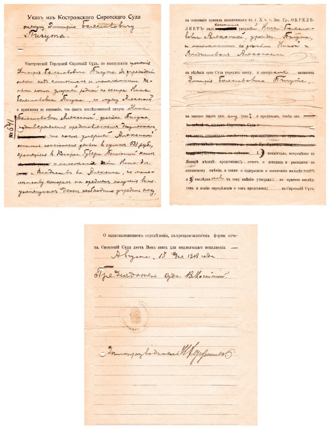 Указ Костромского Сиротского суда Дмитрию Болеславовичу Пигута об опеке над малолетними детьми умершей Нины Болеславовны Алексиной (урожд. Пигута), Ниной и Владиславом. 13 августа 1918 г.
