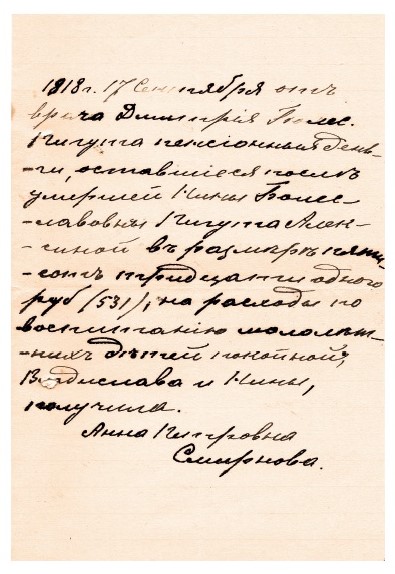 Расписка Анны Смирновой о получении от врача Дмитрия Болеславовича Пигуты 531 руб. на расходы по воспитанию малолетних детей покойной, Владислава и Нины. 17 сентября 1918 г.
