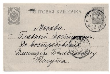 Почтовая карточка, адресованная Дмитрию Пигуте до востребования