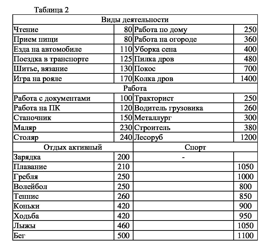 В таблице 2 показаны энергозатраты людей в зависимости от видов деятельности. В таблице так же приведены энергозатраты работников различных профессий. Наименьшие затраты физической энергии очевидно имеют место у работников, работающих с документами и на ПК (100 – 120 ккал/ч). Наибольшие затраты – у строительных рабочих, металлургов и лесорубов (до 1400 ккал/ч).