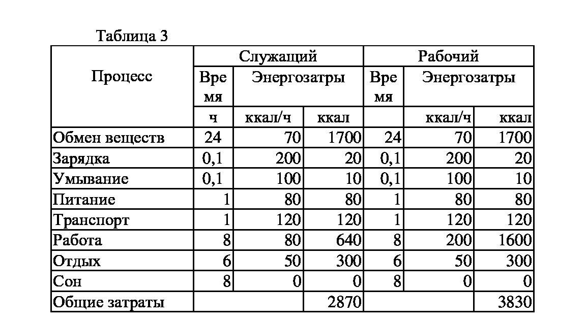 В таблице 3 приведены среднесуточные затраты энергии работников с малой (80 ккал/ч) и умеренной (200 ккал/ч) интенсивностью физического труда.