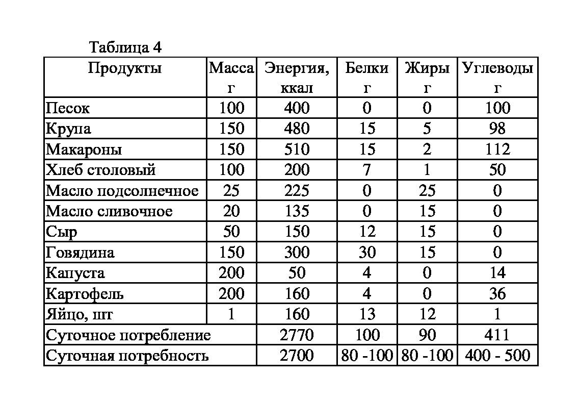 Приведенный базовый набор продуктов по основным компонентам удовлетворяет среднесуточную потребность среднестатистического мужчины (вес 70 кг) при малых физических нагрузках. Используя данные таблиц 1 (энергетическая ценность) и 2 (энергетические затраты) легко рассчитать необходимый объем потребления продуктов при умеренных и больших физических нагрузках. Более полный перечень основных продуктов питания приведен в Приложении 1.