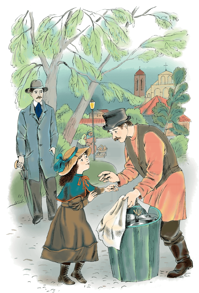 И вот он, Андрей! Опять приехал! Как всегда, черная жилетка надета у него на линялую рубаху, некогда сшитую из розового ситца. Поддевку Андрей надевает только в конце августа, когда перед отъездом обходит своих должников. В эти дни он ходит уже без своей кадки, а из кармана у него выглядывает книжечка: в ней никому, кроме самого Андрея, непонятными иероглифами обозначено, сколько за лето наели в долг мороженого оболтусы-гимназисты, кадеты, юнкера, сыновья «Тещи» и других. В эти дни должники-оболтусы прячутся, и Андрей имеет дело только с разгневанными мамашами. Но честность Андрея настолько общеизвестна, что даже генеральша «Щи кипят» платит не споря. Записано у Андрея в книжечке – значит, столько оболтусы и наели в долг, значит, столько и платить. А сыновьям можно надрать уши и потом.