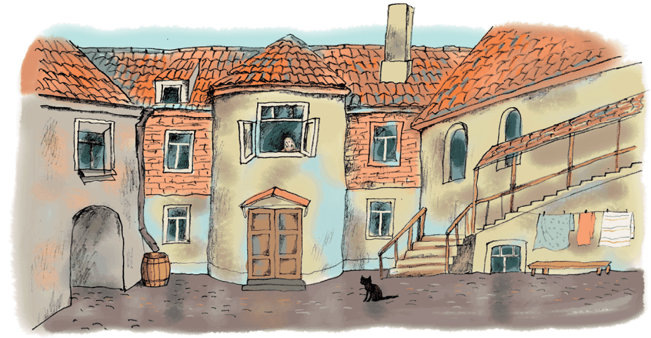На небе всходит вечерняя звезда. Она сидит на кресте соседнего костела, словно ее укрепили на верхушке рождественской елки. В прозрачных вечерних сумерках все кажется нарисованным на картинке: и костел со звездой на кресте, и кованая чугунная ограда сквера, и маленький «толчок» на углу с торговками, похожими на страшных ведьм и волшебниц.