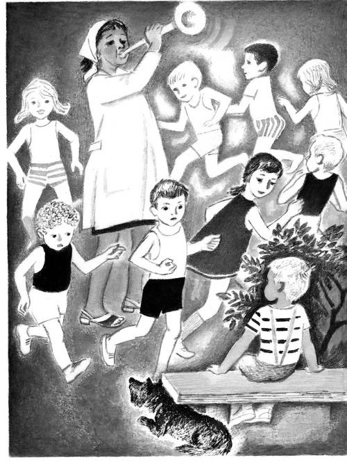 Она приседает – и все приседают. Она встаёт – и все встают. Только один беленький мальчик в кудряшках часто задумывается и продолжает сидеть, потому что разглядывает на земле какой-нибудь цветок или жука, а когда он встаёт, все уже опять приседают.