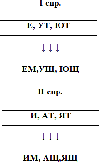 Гласные в суффиксах причастий настоящего времени зависят от спряжения глаголов и конечной буквы их основы.