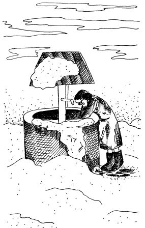 Я оделась, привязала, как смогла, веревку к дужке ведра и отправилась вниз по узкой тропинке. Сруб колодца обледенел так, что на внутренних стенках образовалось «пузо». Веревка замелькала по ледяному наросту. Ведро гулко ударилось о воду. Я без труда вытащила его. Глянула, а воды там всего на четверть. Мало. Решила опять опустить ведро в колодец. А вылить воду не догадалась. Непростительная оплошность!