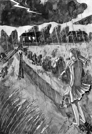 Попутный ветер гнал меня по дороге. Черные тяжелые тучи опустились совсем низко и обложили все небо. Мне казалось, что если я подниму руки, то дотянусь до них. Я даже голову в плечи втянула от страха. Чудовищные безобразные тени кустов то смыкались и расправлялись, то волочились, выполняя круговые и волнообразные движения. Посыпались первые крупные как горошины капли дождя. Сильные косые струи догнали меня уже в поле. Летний дождь показался холодным. Мокрое платье путалось между ног, сандалики скользили, попадая в лужи. В темноте я не могла найти тропинку и побежала напрямик. Ветер трепал колосья и стелил по земле. Они стегали меня по лицу. В очередной раз упав, я подумала: «Может не вставать? А мама?». Цепляясь за стебли, кое-как поднялась, и опять побежала, спотыкаясь и запутываясь в сорняках. Стебли повилики вязали ноги.