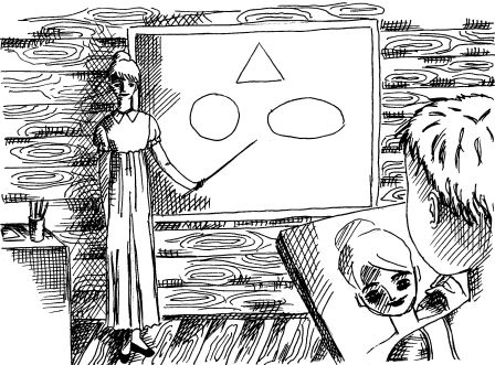 Занятия проходят у нас в столовой сразу после завтрака. Сегодня первый урок – математика. Галя рисует на доске мелом различные фигуры и спрашивает у детей их названия.