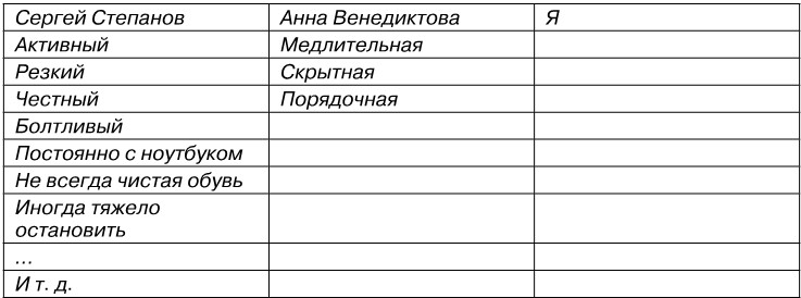 2) В верхней строке первых двух колонок впишите имена двух ваших знакомых. Заполняйте и выписывайте все характеристики, которые придут на ум.