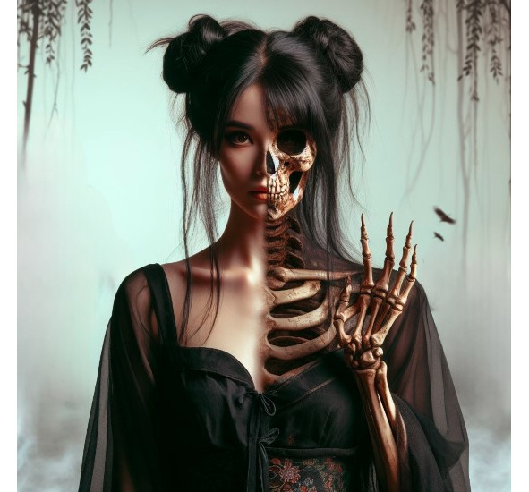 Среди наступающих, перед нами появилась женщина. Она была среднего роста. Одетая в чёрное ханьфу. Она была похожа на сгнившего человека. Половина её лица была прекрасна, а вторая – обнажëнный череп. Растрёпанные волосы, с левого бока и живота были видны кости без плоти. Руки тоже были чистые кости. Полу скелет, полу человек.