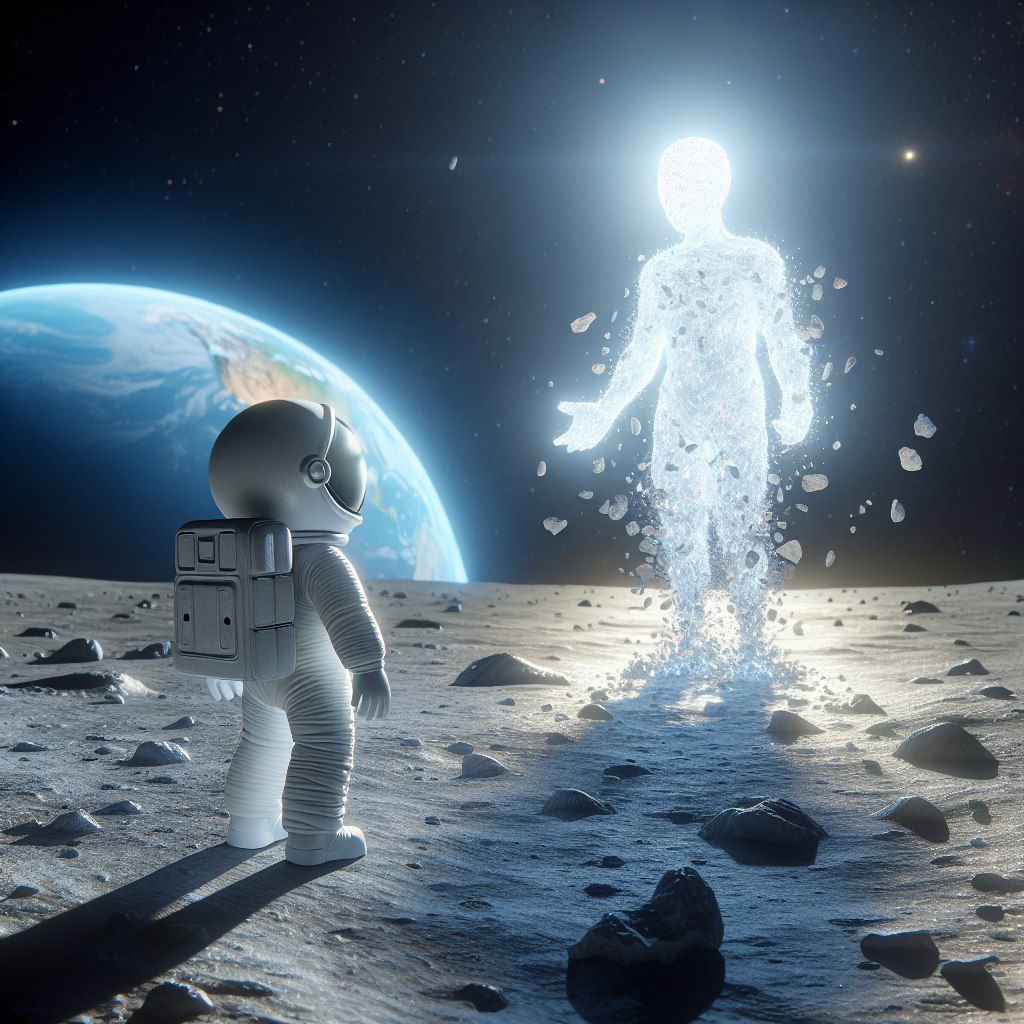 Вдруг из-за кратера показалась странная фигура. Это был Лунный Страж – существо, созданное из лунного света и камня. Оно медленно подошло к Андрею и заговорило голосом, наполненным эхом далёких галактик: «Приветствую тебя, путешественник из далёкого мира. Что привело тебя в нашу скромную гавань?»