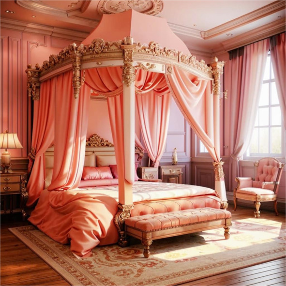 Все двинулись вперед по коридору. Когда поровнялись с первой дверью, Максим звякнул связкой ключей и выбрал ключ с головкой в виде бутона розы. Замок щелкнул и дверь тихо отворилась. Комната была большая. Главным украшением этой комнаты была огромная кровать с балдахином. Здесь еще стоял большой шкаф, пара кресел, туалетный столик с зеркалом в резной оправе. Пол устилал мягкий ковер. Шторы были задернуты. Вся спальня была выдержана в изумительном нежном цвете. Цвет этот часто называют цветом нежного персика.