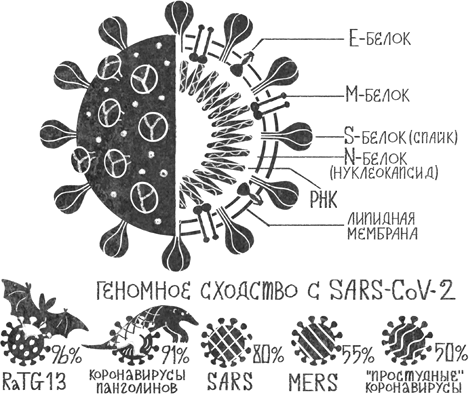 Рис. 2. Частица SARS-CoV-2 – ограниченная липидной мембраной сфера размером около 95 нм без учета торчащих наружу тримеров спайк-белка и 120–130 нм с ними. Внутри компактно упакована геномная РНК, намотанная на каркас из N-белка – в реальной вирусной частице она занимает внутреннее пространство почти целиком. SARS-CoV-2 не слишком похож на другие человеческие коронавирусы – геном ближайшего родственника SARS отличается на целых 20 %. Зато с одним из коронавирусов летучих мышей RaTG13 он схож на 96 %. Не исключено, что ученым удастся найти в рукокрылых еще более близкие вирусы, от которых мог произойти SARS-CoV-2