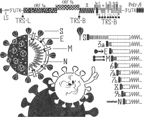 Сначала с вирусной РНК клеточными рибосомами синтезируются две длинные белковые цепи ORF1a и ORF1ab (см. рис. 3), причем вторая половина длинной цепи оказывается сдвинута относительно первой из-за того, что рибосома поскальзывается на особой последовательности и продолжает синтез уже с нового места. Эти цепи разрезаются на отдельные белки, которые выполняют две задачи: 1) обеспечить бесперебойный синтез всех компонентов вирусных частиц и 2) не дать клетке-хозяину сообщить иммунной системе, что произошло заражение. Разрезает ORF1a и ORF1ab находящаяся в них же вирусная протеаза. После того как зараженная клетка порабощена, синтезированный с вирусной РНК фермент со сложным названием РНК-зависимая РНК-полимераза считывает со второй половины той же РНК оставшиеся гены – это в основном гены структурных белков, необходимых для сборки вирусных частиц. И уже на основе образовавшихся коротких молекул РНК рибосомы строят вирусные белки. Синтезировать белки непосредственно с исходной вирусной РНК нельзя: их последовательности как бы накладываются друг на друга (здесь вирус тоже использует сжатие информации), поэтому ген каждого белка нужно получить в виде отдельной молекулы РНК. Сложное объяснение – во врезке, его опять же можно пропустить.