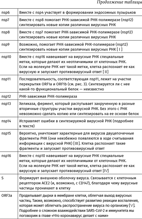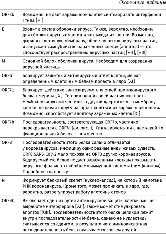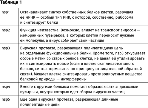 Полный список белков коронавируса SARS-CoV-2 и их функции описаны в таблице 1. Аббревиатурой nsp обозначают неструктурные белки (от английского non-structural proteins). К ним относятся сервисные белки вируса вроде РНК-зависимой РНК-полимеразы и белков, обеспечивающих сборку вирусных частиц, а также nsp, выключающие собственный метаболизм клетки и мешающие ей позвать на помощь иммунную систему. Остальные белки составляют каркас вирусной частицы.