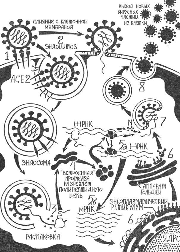 Рис. 4. После того как спайк-белок вируса связывается с рецепторами ACE2 (1), клеточная протеаза фурин или TMPRSS2 разрезает спайк (не показано на рисунке) и вся частица подтягивается ближе к поверхности клетки. Изначально предполагалось, что после этого ее мембрана сливается с клеточной ((2), верхняя стрелка), но позже появились данные, что вирус попадает внутрь клетки путем эндоцитоза ((2), нижняя стрелка). Оказавшись в клетке, вирус выпускает наружу свою геномную РНК, которая выходит из эндосомного пузырька в цитоплазму, где клеточные рибосомы начинают синтезировать с нее длинную полипептидную цепь (3). Один из входящих в нее белков – протеаза, и она разрезает цепь на отдельные белки (4). В том числе протеаза высвобождает РНК-зависимую РНК-полимеразу, которая немедленно начинает синтезировать новые копии вирусной геномной РНК (5.а) и оставшиеся вирусные сервисные и структурные белки (5.б). Последние отправляются в эндоплазматический ретикулум, где происходит сборка новых вирусных частиц (6). Она продолжается в аппарате Гольджи, а затем в заготовки будущих вирусов загружается геномная РНК и уплотняется, наматываясь на пришедший из цитоплазмы новосинтезированный N-белок (7). В мембранных (эндосомных) пузырьках готовые частицы подплывают изнутри к клеточной мембране, пузырьки сливаются с ней, и новые вирусные частицы оказываются снаружи клетки (8)