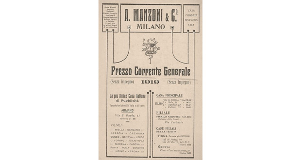 Вслед за развитием экономики в Италии развитие «réclame» в печати так же получило значительный импульс. Первым был фармацевт из Брешии Аттилио Манзони, который создал в 1863 г. с компаньонами Абрами и Сандри первую итальянскую концессию (рис. 4) «A. Manzoni&C.», которая стремительно стала самой значимой на рынке, и до сих пор с успехом работает в Италии.