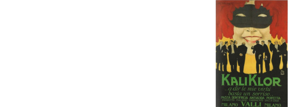 Использование радио для рекламы принесло также прогрессивную переоценку применения слова в плакатах. В Италии восстановление роли слогана началось в 1919 г. пионером рекламы, который уже упоминался выше, Луиджи Дал Монте Казони. Прежде чем открыть свое агентство «ACME-Dal Monte», он был управляющим рекламным офисом «Vermondo Valli di Milano», для которого запускал конкурс с призом в 10.000 лир. Участники должны были искать фразу, подходящую для рекламирования зубной пасты «Kaliklor». Победил «A dir le mie virtù basta un sorriso»16 – успешный слоган, продержавшийся в течение 20 лет и вошедший также в языковой оби ход итальянцев (рис. 22). В последующие годы появились и другие многочислен ные слоганы, которые имели успех и использовались многие годы, как, например, «Brill, la perla dei lucidi» (1927), «April’occhio: per la salute Acqua Giommi» (1928), «Chi beve birra, campa cent’anni» (1929) и «Un Ramazzotti fa sempre bene» (1934)17.