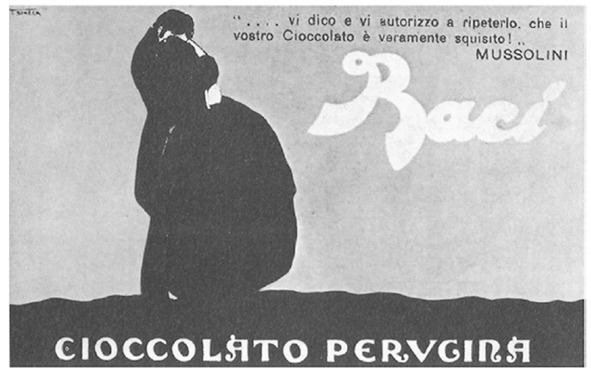 Не удивителен поэтому случай на встрече 1923 г. на предприятии «Buitoni-Perugina», где Муссолини произнес фразу в абсолютно рекламном тоне: «Vidico, e vi autorizzo a ripeterlo, che il vostro cioccilato é veramente squisito!»20 – которую компания опубликовала на следующий день на целой полосе в «Coriere della Sera» на фоне рисунка с коробкой конфет «Baci» (рис. 23). И некоторое время спустя Муссолини подтвердил в ежедневнике «Il Resto del Carlino» публикацию объявления с фразой: «…vecchio e sempre giovane fascistissimo Carlino. M.»21 – где буква «М» была напечатана прописной и графически повторяла его известную подпись.