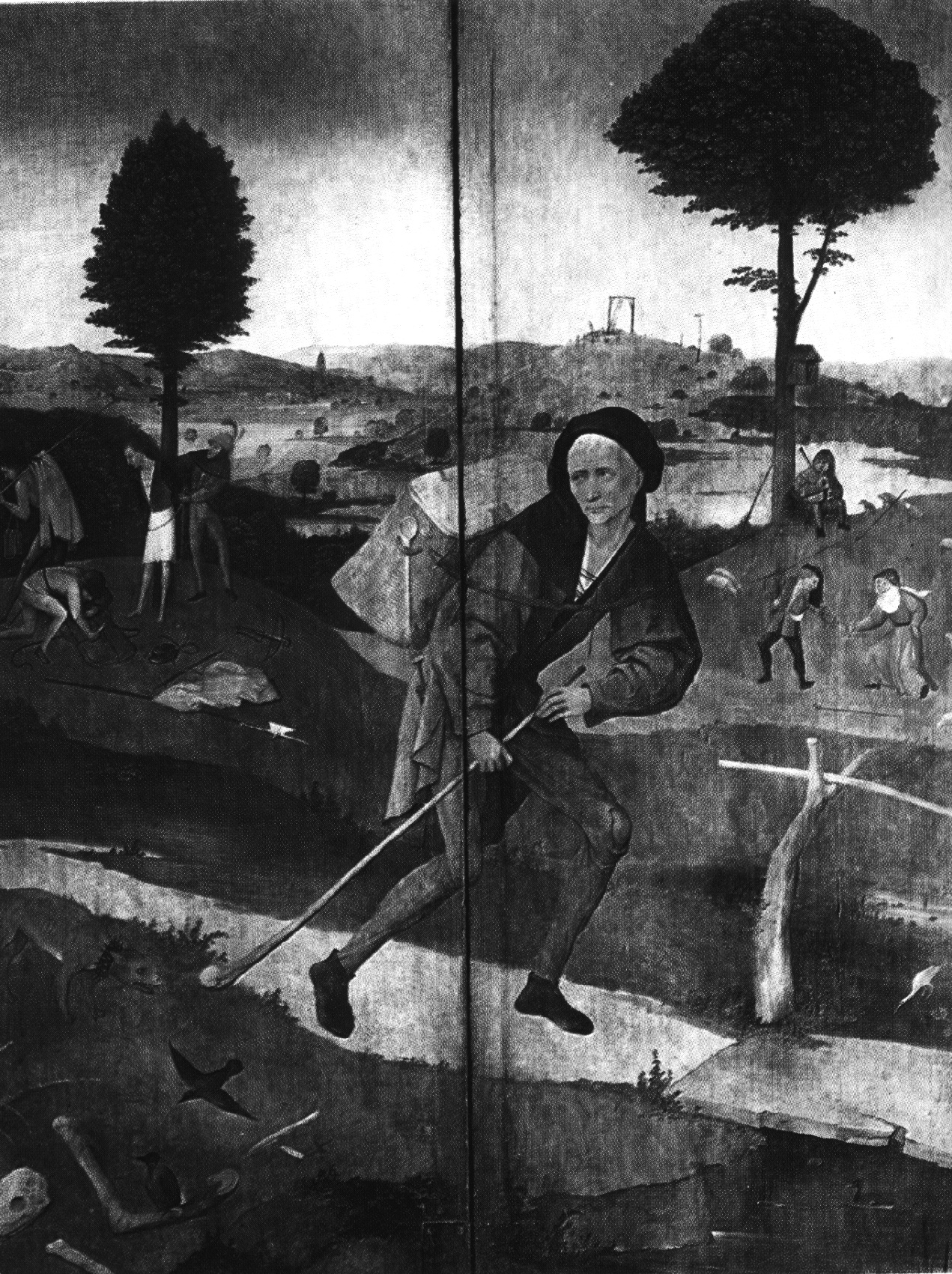 Тем более что Босх, по своим временам, светский художник. Он горожанин, но не мещанин. Представитель среды, которая концентрировала работу мысли. Из этой среды, в это же время, в том же месте появился Эразм Роттердамский. «Название безумца более подобает праведникам, нежели толпе.» Не о Босхе ли это сказано? Эразм на двадцать лет моложе, и вполне мог видеть его картины. Ведь в Босховском изображении можно буквально увидеть и рассмотреть повседневную проблематику того времени, круг мыслей, печалей, тревог, нравов. Его ирония, мрачная ирония того времени очевидна. Можно посмотреть на лица, которые выписаны крупным планом. Увы, в большинстве своем это уроды. Кроме лика Христа, и спешащего куда-то с оглядкой длинноносого путника, в котором искусствоведы распознают самого Босха. Пожалуй, это так. Спешащего на полусогнутых ногах, то ли от спешки, то ли от ужаса, когда ноги подкашиваются. За спиной этого спешащего разбойники грабят и казнят привязанную к дереву жертву, на дальнем холме торчит виселица, в центре изображения кавалер с дамой отплясывают танец на глазах устроившегося отдохнуть бродяги. У путника (согласимся, что это Босх) длинная палка, похожая на клюшку для гольфа и явно вычерченная под линейку, с костяным наконечником, на который нацелилась противная псина. Начав рассказ (а его живопись – это бесконечный рассказ), Босх уже не может остановиться. Если бы к тому времени Левенгук (кстати, земляк Босха) открыл мир микробов, Босх изобразил бы и их. Можно не сомневаться. Амебы и прочие жгутиковые очень бы вписались в его сюжеты, тем более, что кое где (большой фантазии не нужно) они просматриваются.