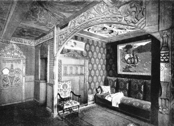 Согласно этому же первоисточнику, до 1917 года квартира хозяина дома являла собой настоящую сокровищницу совершенно уникальных произведений искусства, представлявших собой неотъемлемую часть интерьера. В нише большого окна, например, находился цветной витраж «Въезд победителя», изготовленный мастерами Строгановского училища по рисунку самого М. Врубеля. Пространство над письменным столом занимала вмонтированная в стену работа художника Ф. Малявина «Мужик». Через березовую резную арку, отделяющую столовую от комнаты под красноречивым, объясняющим ее назначение названием «Думка», прекрасно смотрелась картина Н. Рериха «Заморские гости».