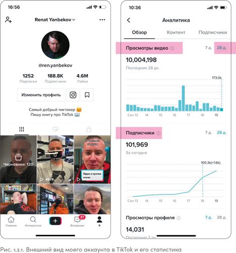 На рис. 1.2.1 вы можете оценить внешний вид моего профиля в TikTok, а справа – статистику за 28 дней апреля 2020 года: за эти четыре недели я получил 10 млн просмотров видео и 14 000 посещений моего профиля, хотя не являюсь суперзвездой. Всё это стало возможным благодаря самой площадке.