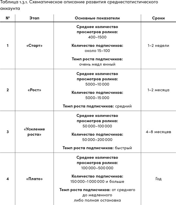 Конечно, таблица 1.3.1 носит условный характер – цифры и сроки могут варьироваться. Но общие этапы продвижения, указанные в ней, характерны для любого аккаунта и справедливы не только для TikTok. Давайте разберем их подробнее.