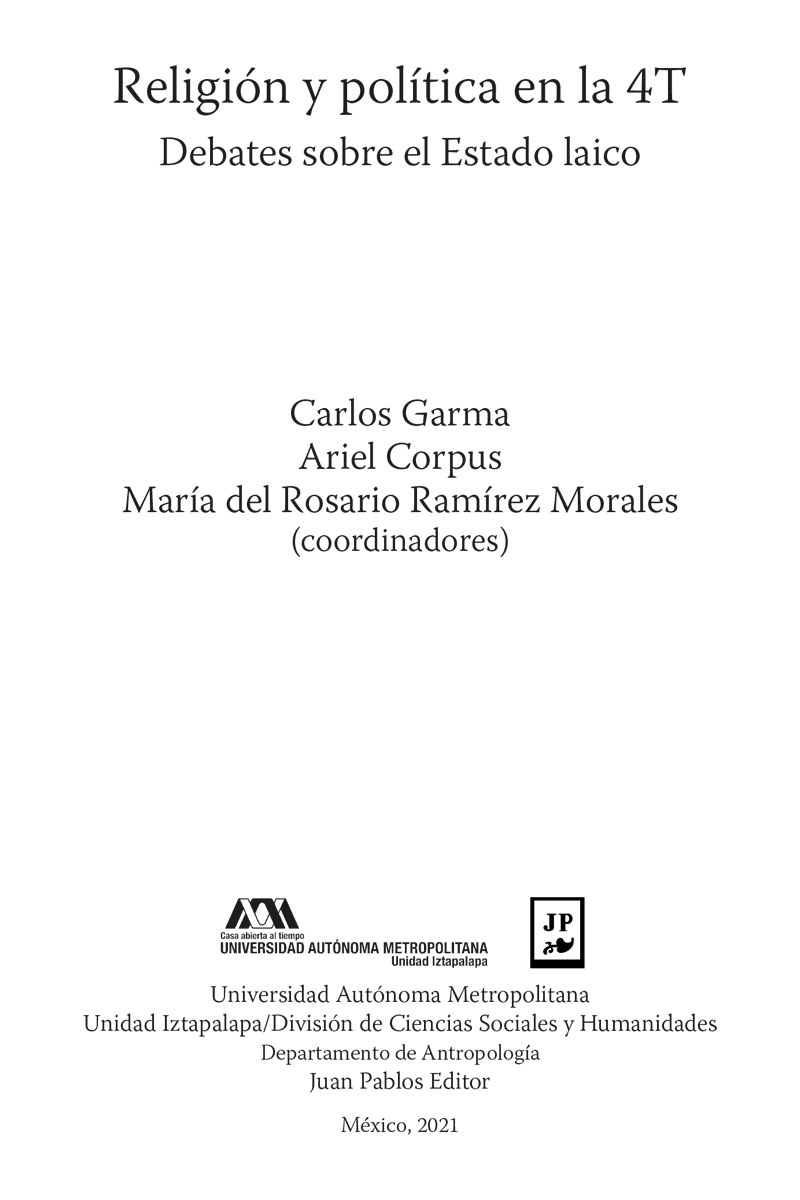 Religión y política en la 4T : debates sobre el Estado Laico / Carlos Garma, Ariel Corpus y María del Rosario Ramírez Morales, coordinadores. - - México : Universidad Autónoma Metropolitana : Juan Pablos Editor, 2021