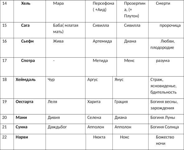 Не все колонки заполнены, ибо есмь божества что ипостасей не имеют точных средь сих 3 религий. А есть и где повторяются, то от того что схожи очень и на одного бога и на иного. Но не тем ни иным не являются. Здесь не все божества, но самые основные.