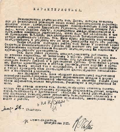 Характеристика, выданная Н.И. Ежову Семипалатинским губкомом РКП(б). 22 июня 1923.
