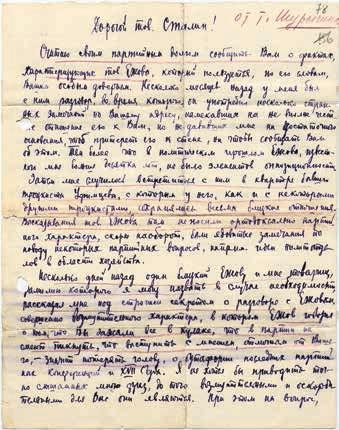 В верхнем правом углу письма помета красным карандашом: «От т. Шурыгина». Именно такие пометы обычно делал Сталин, знакомясь с поступавшими на его имя документами. На письме нет штампа регистрации – номера и даты поступления. Возможно, оно было передано лично. Каким образом – не известно. Имя Сергея Шурыгина в списках делегатов съезда не значится. Самое неприятное для Ежова заключалось в том, что этот сигнал поступил за пару дней до выборов ЦК, куда Ежов так стремился. И от менее серьезных обвинений рушились карьеры, если Сталин принимал на веру написанное10. Но ничего не случилось, и письмо в итоге оказалось у Ежова. «Доверие Кобы» перевесило все наветы. Ему нужен был этот на вид скромный и исполнительный аппаратчик. И даже если за ним есть что-то, скажем, какой-то хвост из прошлого, не беда. Всему свое время. Чувствовалось, что Ежов – человек новой формации сталинских партаппаратчиков. Его коллеги по КПК отзывались о нем негативно: «Груб, упрям, поверхностный, подозрителен, мелочный. Хватает за всякое слово, используя для обвинения»11. Ну разве не то, что нужно?