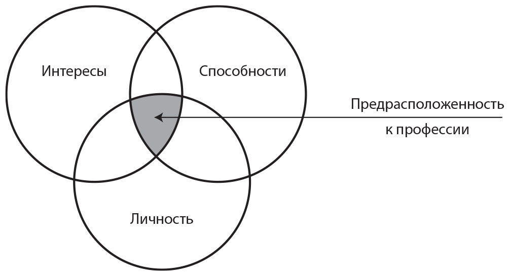 Уверен, вы не раз видели пересечение трех окружностей – «Интересы», «Способности» и «Личность». Сочетание этих факторов и дает психологическую предрасположенность к той или иной профессиональной деятельности.