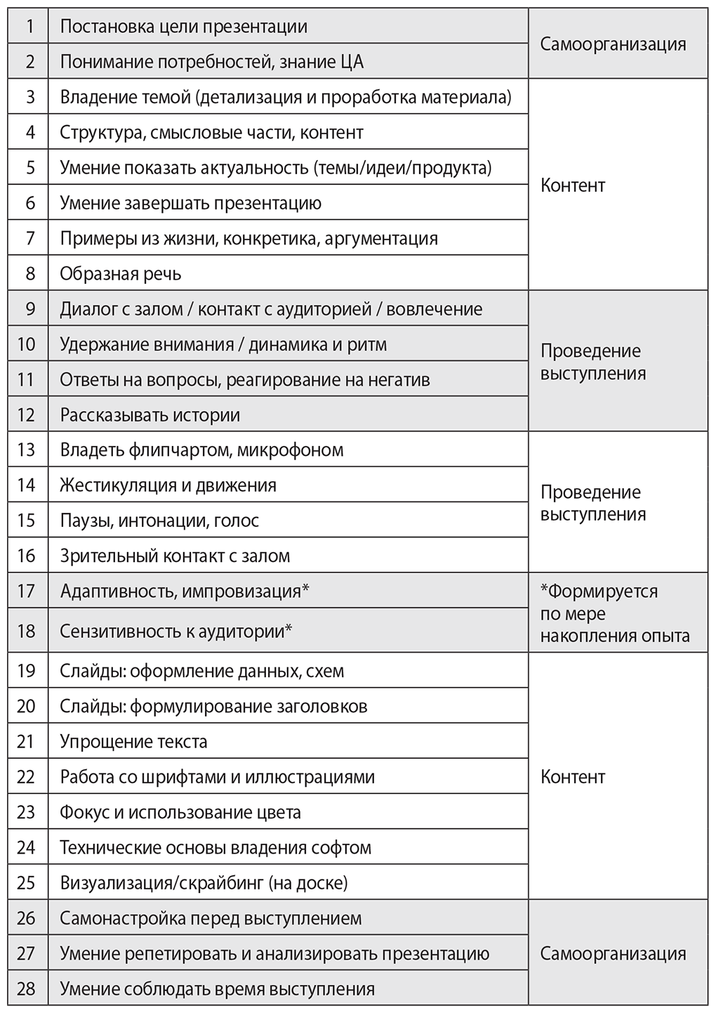 Анализируя данные, мы заметили, что некоторые ответы экспертов регулярно повторяются. Это было сигналом, что наши респонденты считали определенные умения весьма значимыми для ораторов, а потому указывали их в обязательном порядке. Так мы составили шорт-лист умений, своего рода «гигиенический набор» спикерских компетенций: