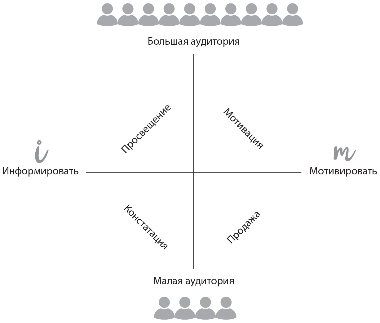 На другом полюсе шкалы находится мотивирующая задача. Вообще, сам по себе термин «мотивация» имеет в себе что-то пафосное. Однако здесь я хочу оттолкнуться от значения латинского корня -mot-: «движение», «деятельность», «порыв», «вдохновение» и даже «танец». Таким образом, задача спикера уже заключается не только в том, чтобы повысить информированность слушателей, а в том, чтобы воздействовать на намерения, приводящие аудиторию в движение. Это движение проявляется в изменении ее поступков, взглядов, образа мыслей и т. д. До начала презентации/выступления аудитория находилась в состоянии А, а после – пришла в состояние Б.